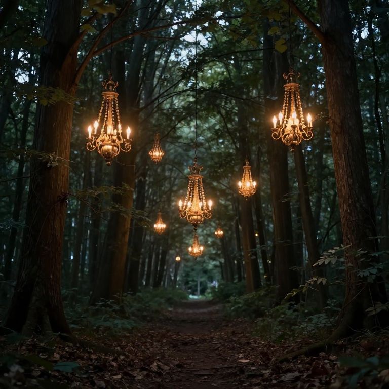 In a surreal forest where upside-down chandeliers hang like celestial lanterns, a quiet luminescence bathes the earth, evoking a sense of ethereal wonder and introspective serenity.