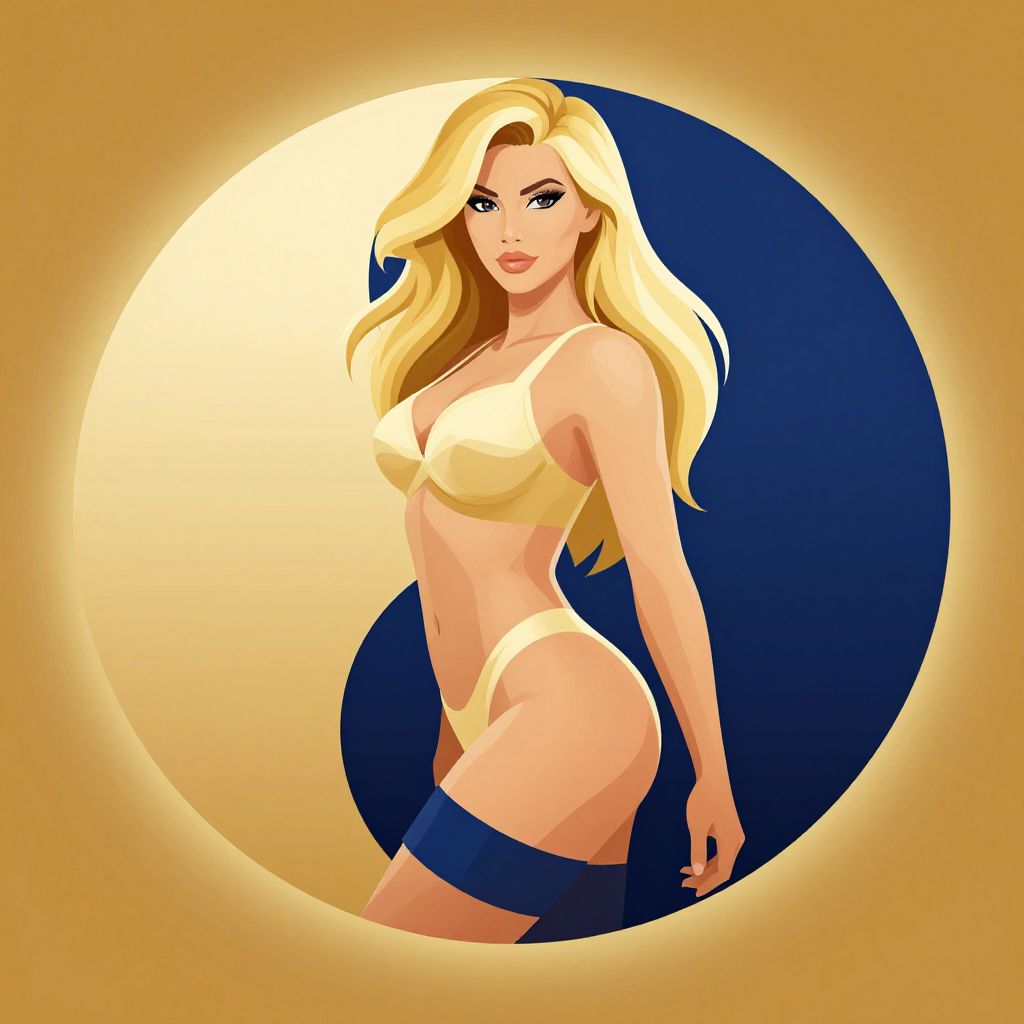 Digital illustration of a blonde woman with large breasts, wearing yellow lingerie and blue garter, standing against a glowing yellow and blue circular background.
