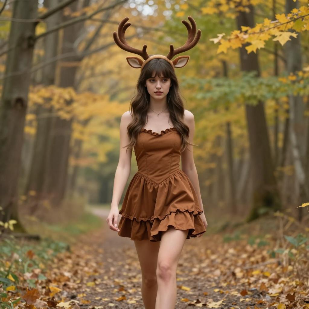 Brown dress deer costume, photograph of a young woman with long brown hair, wearing a brown sleeveless dress with a ruffled skirt, and antlers on her head, walking down a forest path, autumn colors, trees with yellow and green leaves, soft light, natural setting, realistic style, realistic proportions, cute and mysterious atmosphere