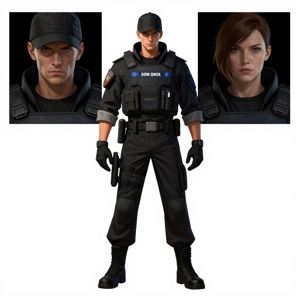 Digital artwork of a stern, muscular male SWAT officer in black uniform, cap, and tactical gear, with close-up portraits of him on either side.