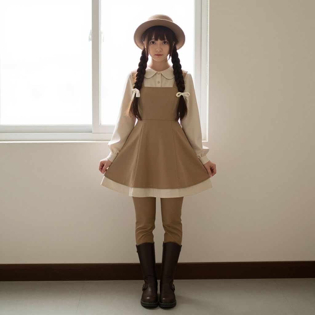 Adult annie costume, 1girl, solo, brown hair, hat, indoors, standing, twintails, full body, looking at viewer, long sleeves, pants, window, twin braids, dress, long hair, boots, braid, ribbon