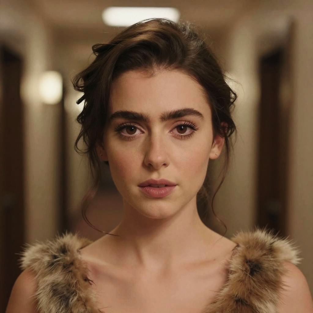 Closeup headshot of S102_MadiCollins, an attractive woman, in a (hallway), wearing a (fur-dress:1.2), (8k, RAW photo, best quality, depth of field, ultra high res:1.2), (absurdres, intricate, photorealistic, masterpiece, ultra-detailed, Unreal Engine:1.3)