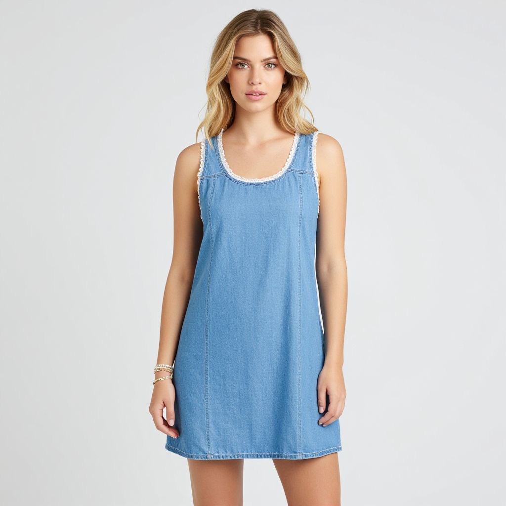 Photograph of a blonde woman with wavy hair standing against a plain white background. She wears a sleeveless, light blue denim dress with a white lace trim around the neckline and straps. The dress is loose-fitting, reaching mid-thigh. She has fair skin, light makeup, and is looking directly at the camera with a neutral expression. She wears a simple white bracelet on her left wrist. The image is well-lit, highlighting the texture of the denim fabric and the lace trim. The overall style is casual and minimalistic.