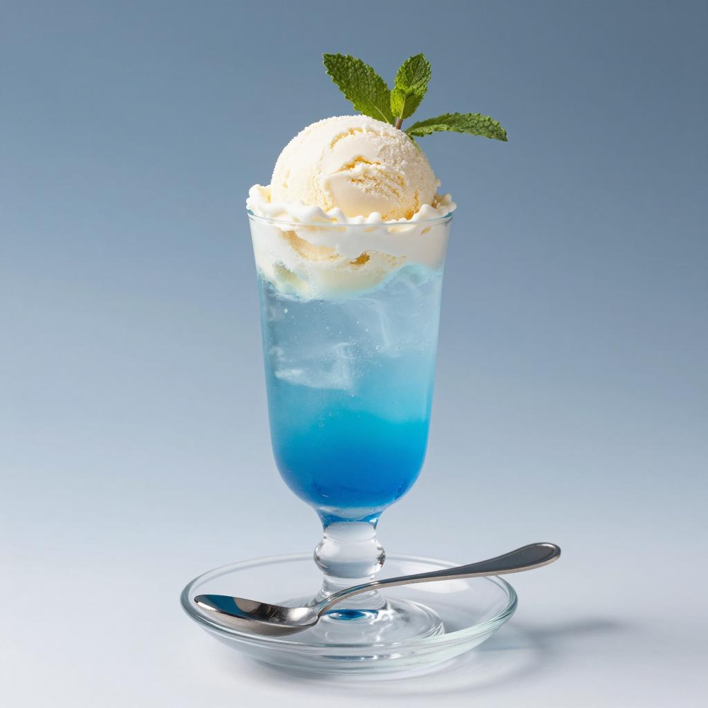 Photograph of a gradient drink in a glass with a bulbous base, transitioning from blue at the bottom to purple and pink at the top. The drink is topped with a white ice cream scoop and a red cherry on a stick. The glass sits on an ornate, clear glass saucer. The background is a plain, light gray wall, and the drink is placed on a wooden table with a rich brown grain.