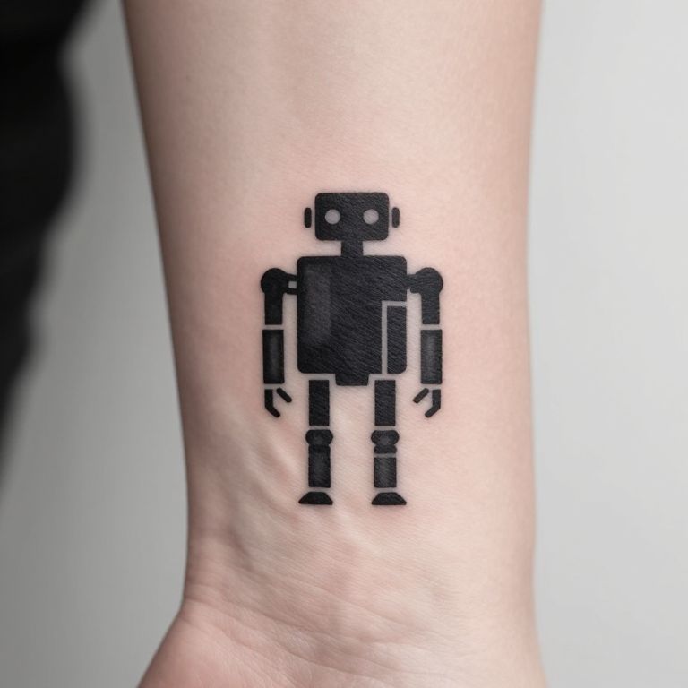 Minimalist robot tattoo featuring a simplified robot silhouette, crafted with geometric lines and minimal detailing, monochrome palette, clean and precise ink strokes, futuristic yet understated style suitable for a small tattoo on the ankle or wrist.