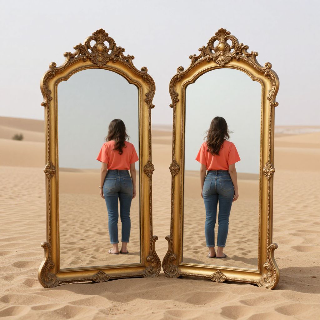 Two ornate gold mirrors stand side by side in a vast desert landscape, each reflecting the back of a woman dressed in a vibrant coral top and denim jeans, creating a surreal juxtaposition between reality and reflection.