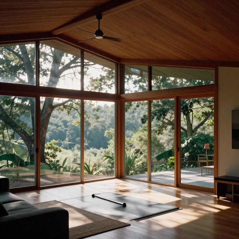 Photograph of a sunlit, modern living room with large wooden-framed glass walls, showcasing a lush, tree-filled outdoor garden. Ceiling fan,