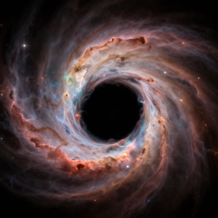 Photograph of a cosmic whirlpool galaxy with a dark central void, surrounded by vibrant, swirling clouds of blue, white, and red gas and dust