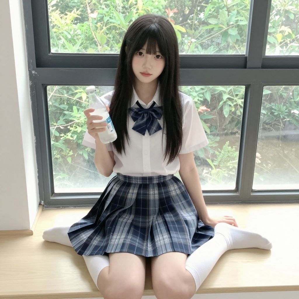 Best quality, 1girl, solo, long hair, looking at viewer, skirt, jk, shirt, black hair, bow, holding, sitting, school uniform, full body, white shirt, short sleeves, socks, indoors, bowtie, black eyes, plaid, kneehighs, window, plaid skirt, no shoes, bottle, white socks