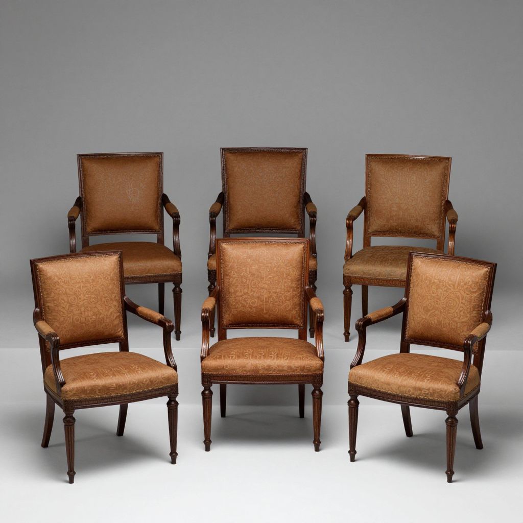 Photograph of six antique-style armchairs arranged in a semi-circle against a plain grey background. The chairs have dark wooden frames with curved arms and tapered legs, featuring a classic design. They are upholstered in brown, textured leather with visible grain patterns. Each chair has a high, square backrest and a cushioned seat. The leather has a slightly worn, vintage appearance, adding to the antique aesthetic. The chairs are evenly spaced, creating a balanced, symmetrical composition. The lighting is even, highlighting the rich brown tones and textures of the leather and wood.