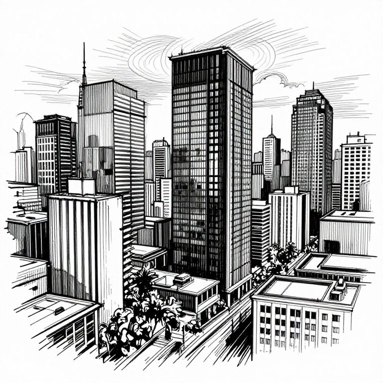 This black and white digital drawing depicts a bustling city skyline in a stylized, cross-hatched manner. Tall, modern skyscrapers with varied architectural designs dominate the scene, with one particularly tall building in the center. The buildings exhibit a mix of glass and concrete textures. In the foreground, smaller buildings and trees are visible, with streets and cars creating a sense of urban life. The background features a clear sky with simple line work suggesting clouds. The overall style is reminiscent of urban sketch art, using thick, bold lines to create depth and contrast.