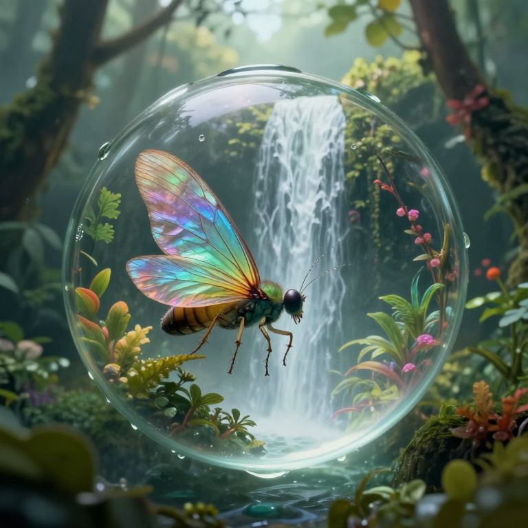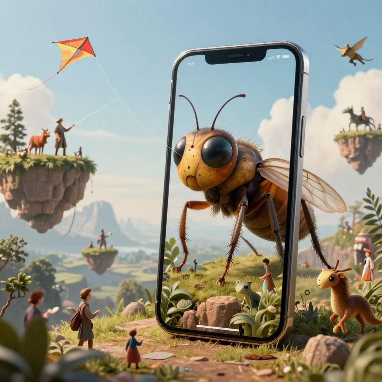 A surreal digital landscape combines modern technology with dreamlike imagination, depicting an oversized smartphone screen extending infinitely and revealing intricate details through the eyes of an exaggerated insect. This boundless world is populated by fantastical landscapes merging seamlessly into one another, including floating islands inhabited by diminutive figures from history engaging in playful activities such as kite-flying and riding mythical creatures. The image evokes curiosity, wonder, and a hint of nostalgia for simpler times within this vast digital realm, embodying an artistic style that fuses whimsy with surrealistic exploration.