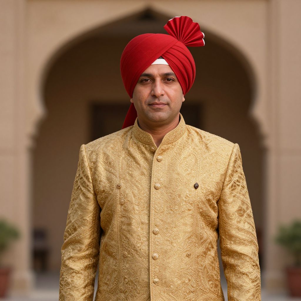 "Marriage Sherwani, man in a red turban and gold jacket"
