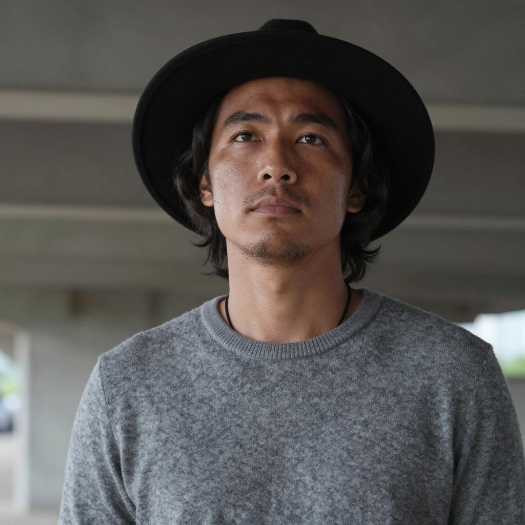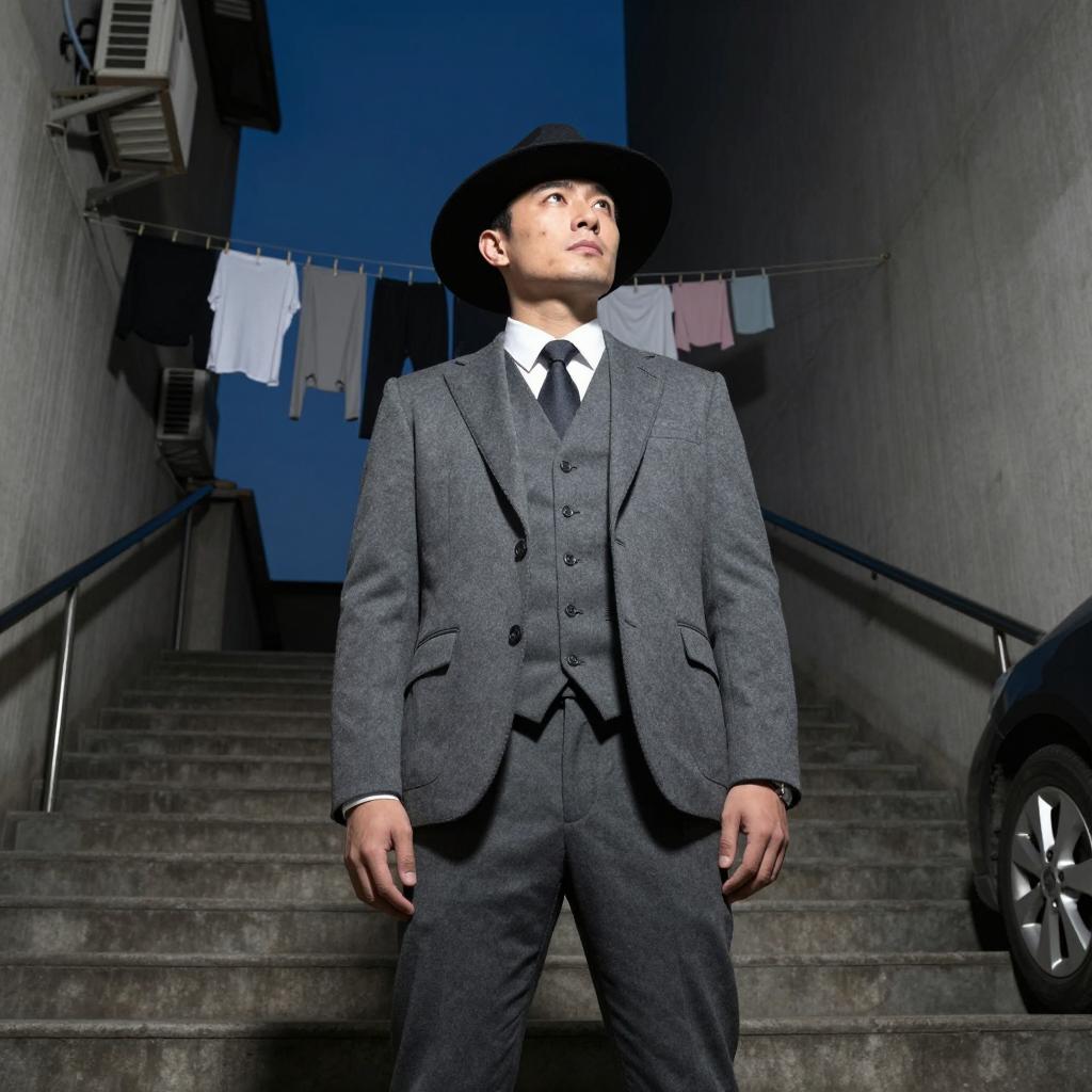 Man in gray three-piece suit and black hat, looking up, standing on urban staircase. Dark blue sky above, concrete building walls, laundry hanging on wire. Low angle shot, man's face slightly upturned. Car wheel partially visible on right.