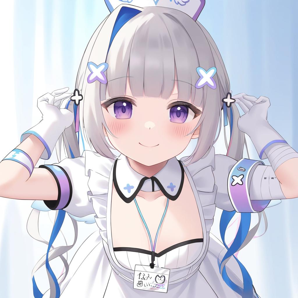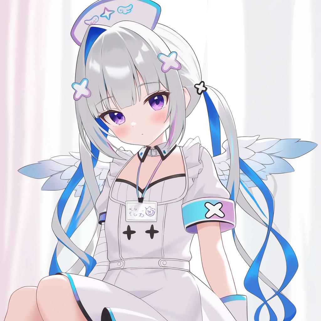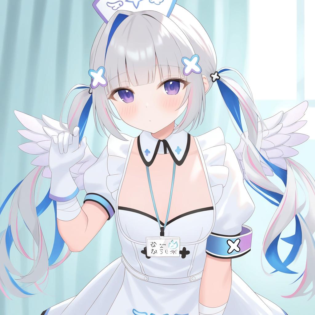 Amane kanata (nurse), hololive, 1girl, angel wings, angel wings, purple eyes, blue hair, grey hair, colored inner hair, single hair intake, official alternate hairstyle, streaked hair, official alternate hair length, long hair, pink hair, x hair ornament, twintails, blunt bangs, small breasts, flat chest, nurse cap, white gloves, white dress, white apron, detached collar, puffy short sleeves, virtual youtuber, virtual youtuber, feathered wings, feathered wings, nurse, nurse, bandaged arm, id card, armband, by artist paint musume, leet