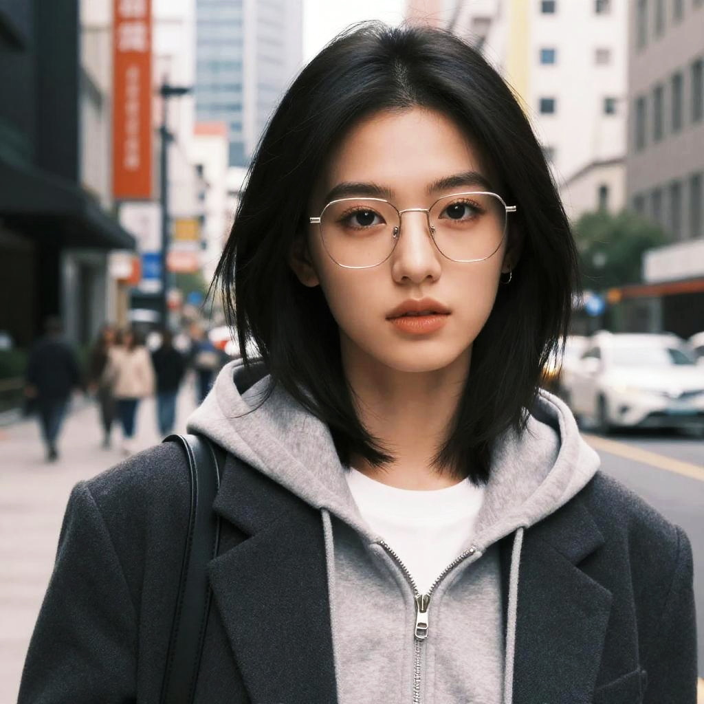 Black hair with glasses, a stylish young woman in trendy urban streetwear, soft natural lighting, vibrant city background, detailed facial features, modern aesthetic