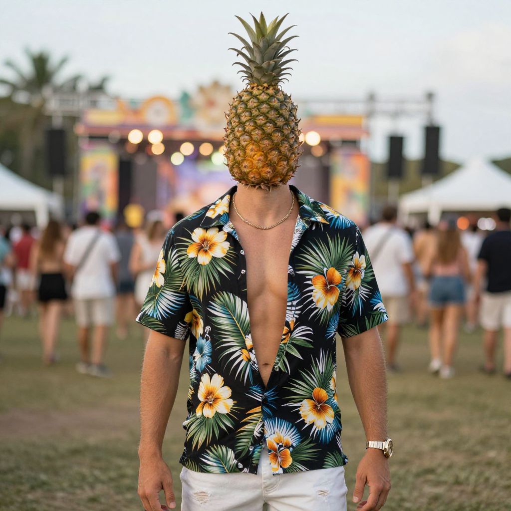 "Tropical Festival Outfit, man in hawaiian shirt with pineapple on head"