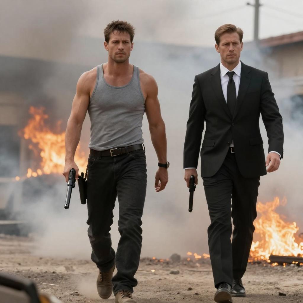 Muscular man in a wet, gray tank top and brown pants stands amid chaos. Background: burning white building, helicopters, smoke, and fire. Man has short brown hair, intense expression, right hand on car, left hand on hip. Multiple helicopters in sky.