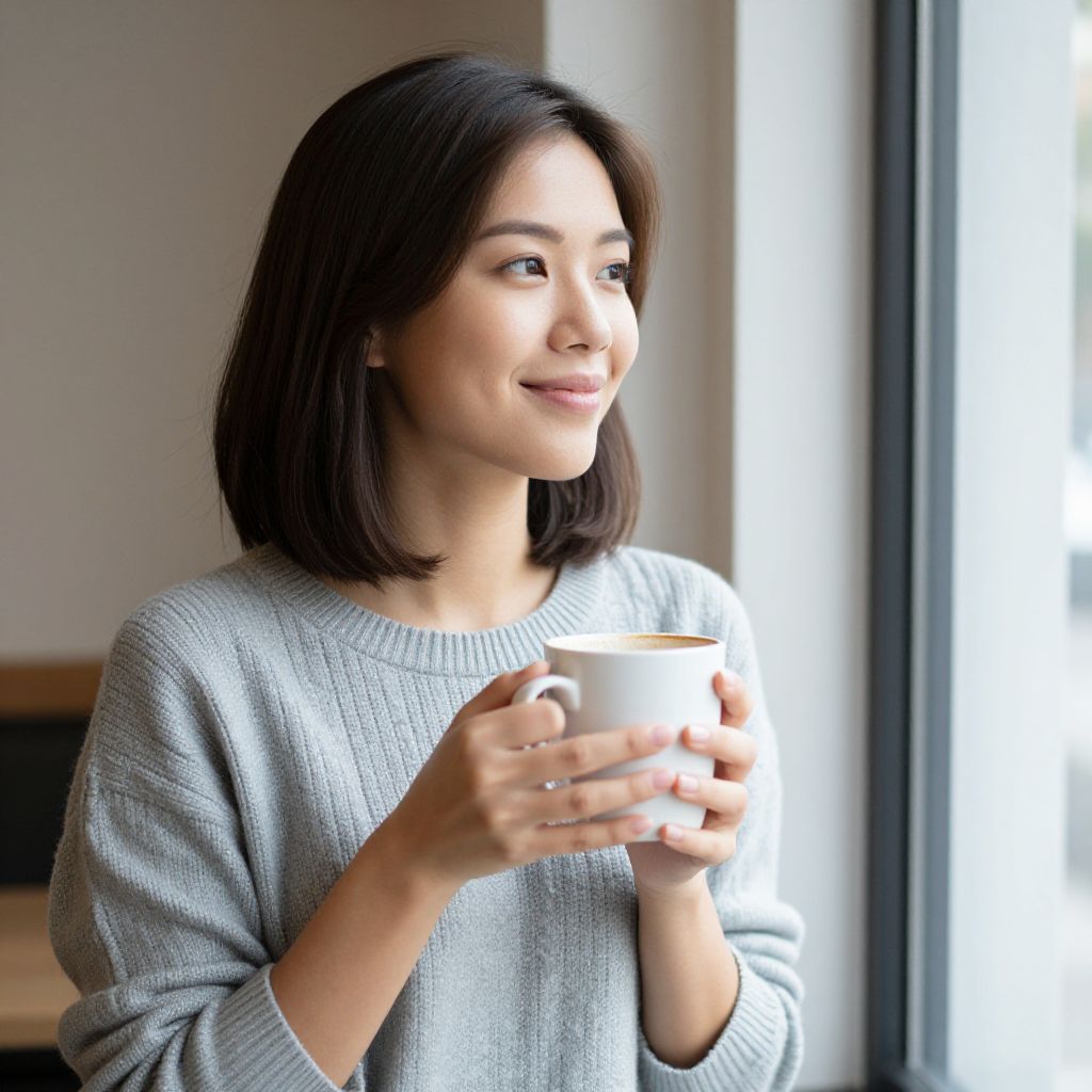 Photograph of an Asian woman with medium-length, straight black hair, smiling gently while holding a white ceramic mug in both hands. She has a light skin tone and is wearing a light gray, knitted sweater. She is standing near a large window on the right, with natural light illuminating her face. The background is blurred, featuring a beige wall and a wooden shelf. The overall mood is warm and relaxed, with a focus on her serene expression and casual attire.