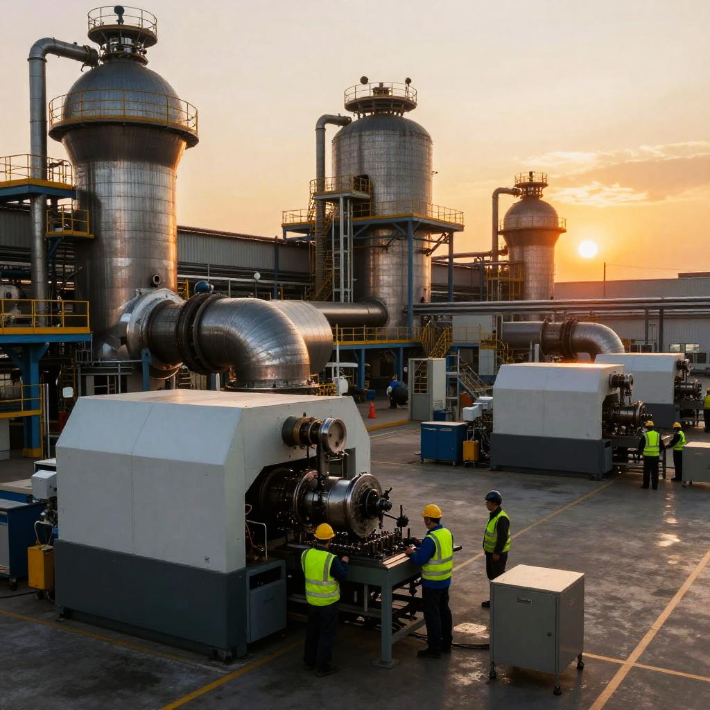 Industriefoto of a sprawling modern factory at sunset, giant machines humming, workers in safety gear inspecting assembly lines, dramatic lighting highlighting metallic textures and industrial architecture, hyper-realistic style with warm tones.