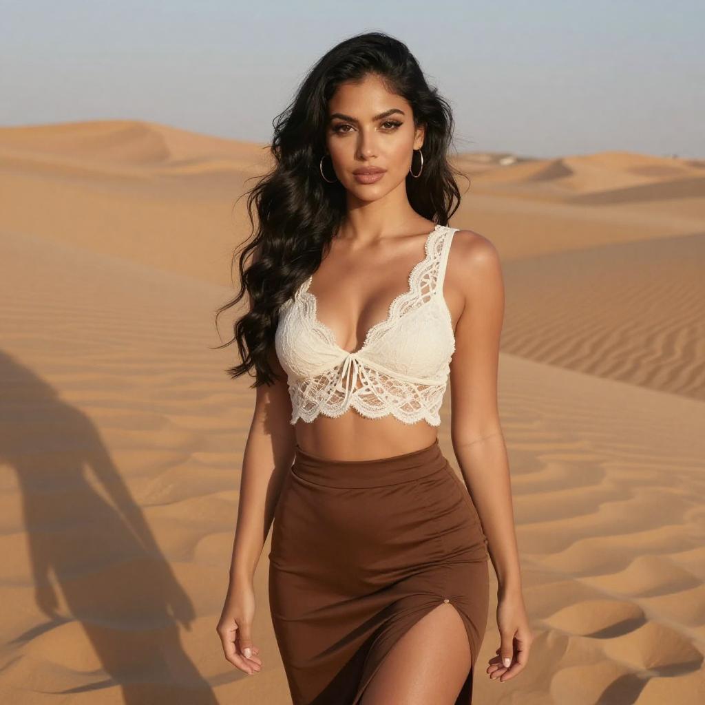 Photograph of a stunning woman with long, wavy black hair standing in a desert. She's wearing a white lace crop top with a deep neckline that shows some cleavage, and a brown, high-waisted, thigh-high slit skirt. Her skin is a warm, sun-kissed tone. The golden sand dunes in the background are lit by the setting sun, creating beautiful shadows. She looks directly at the camera with a confident expression.