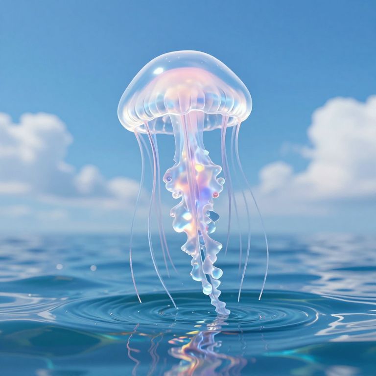 A fantastical 3D-rendered jellyfish with translucent, crystalline tentacles floats serenely above a shimmering ocean surface, its ethereal glow casting prismatic reflections beneath, set against a vivid blue sky dotted with fluffy clouds.