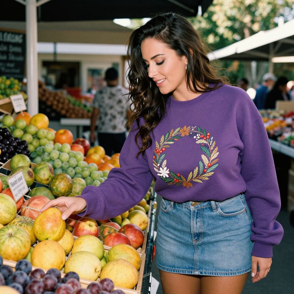 A woman in an oversized purple crewneck sweatshirt with a holiday wreath motif and a blue denim mini skirt, enjoying a sunny day at a local produce stand, examining fresh fruits with a smile, captured in a Kodak SP analog photo style. Sexy. Pretty face and beаutiful eyes. Big breasts