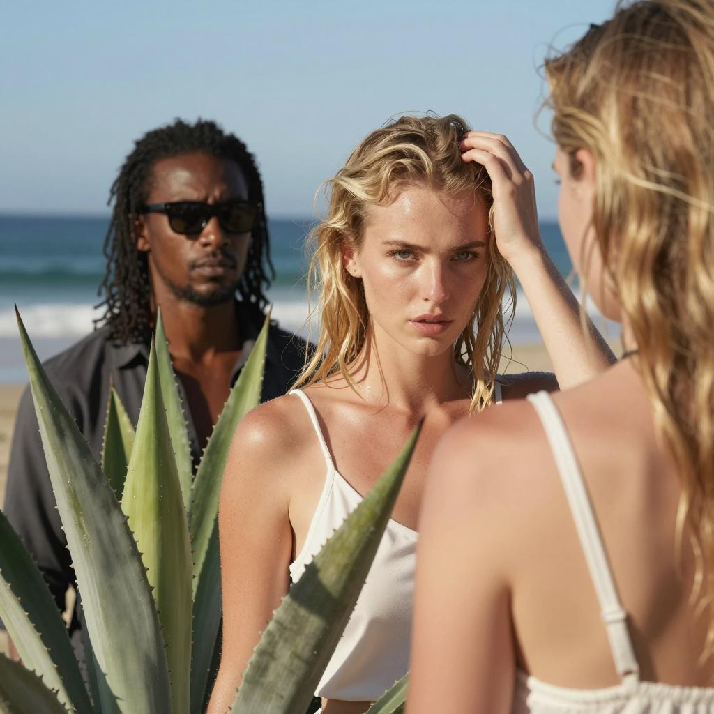Two people. The man on the right has a dark-skinned face with intricate black tribal tattoos covering his cheek, ear, and forehead. His expression is serious. The woman on the left has light skin, dark hair, and green eyes, with a neutral expression. Background is red. The man's tattoos are complex swirls and geometric patterns. Two people.