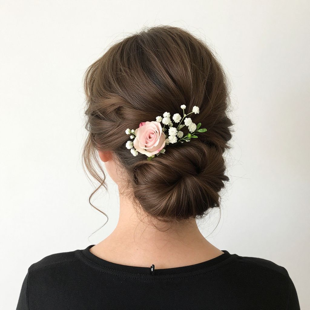 Elegant updo hairstyle featuring a low bun adorned with a delicate floral accessory, including a small pink rose and white baby's breath, complemented by green foliage, worn by a woman with long brown hair and a simple black top against a plain white background.