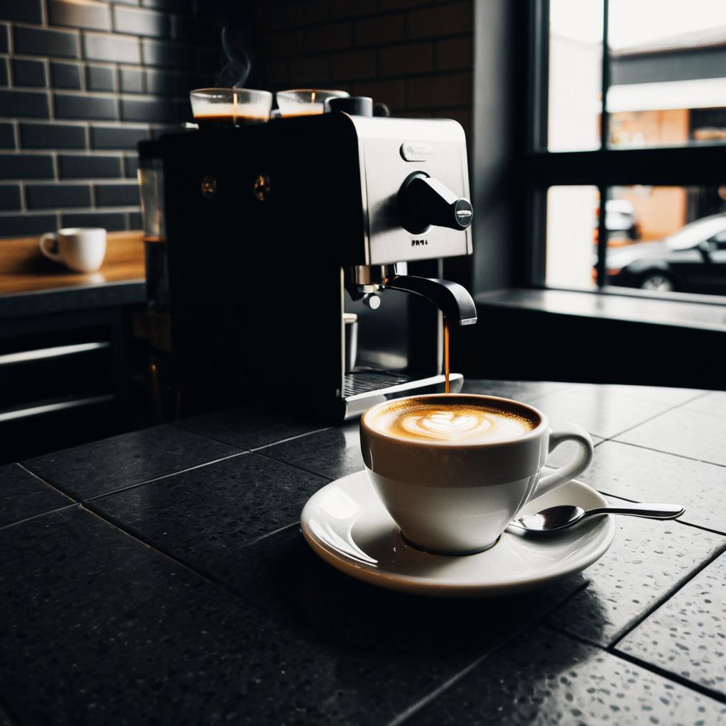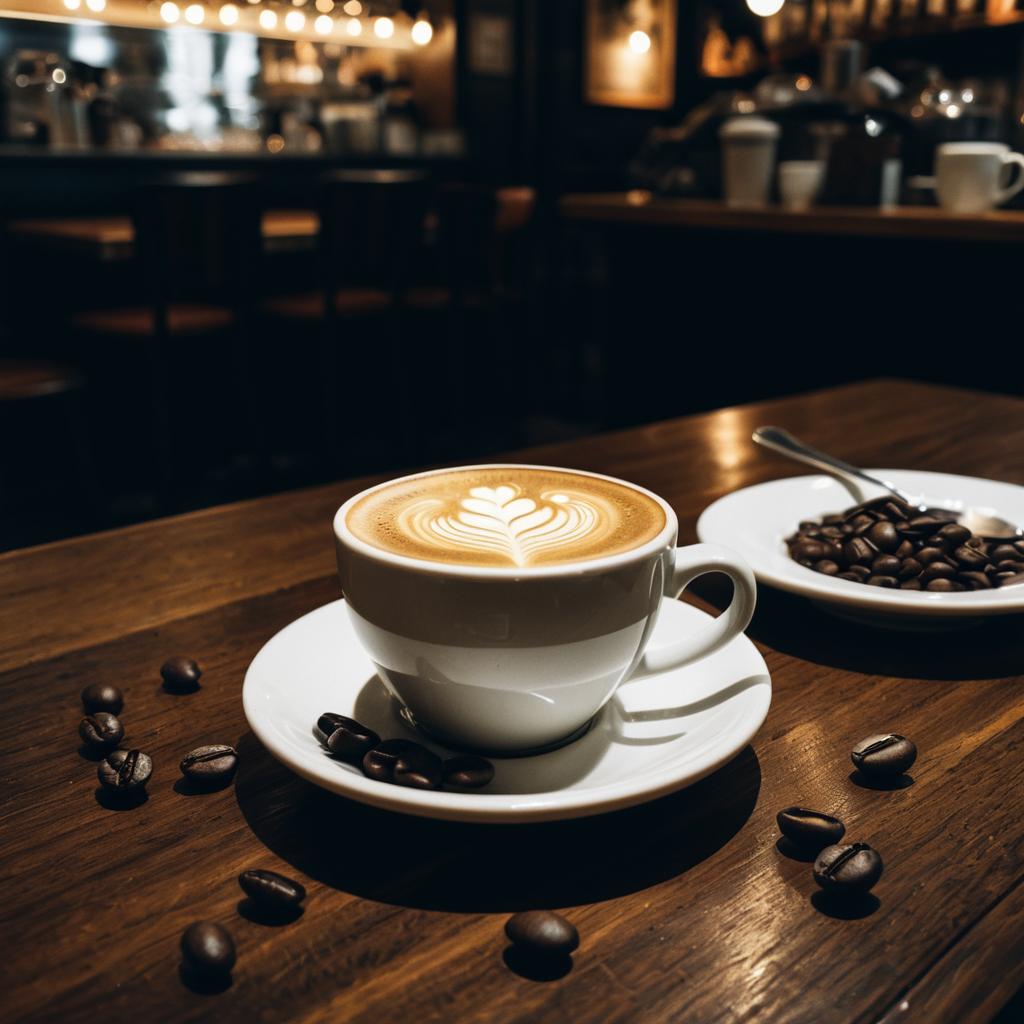 A black coffee cup with intricate latte art featuring a vanilla-flavored latte, set on a white saucer with a decorative spoon, placed on a marble table. The image is captured in a film noir style with high contrast and a nostalgic, textured atmosphere.