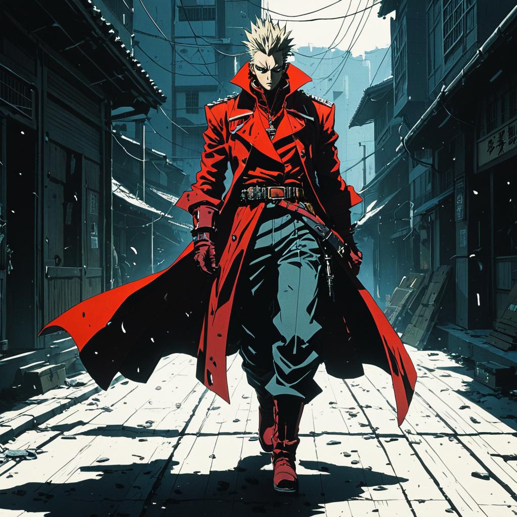 Illustration of an anime character resembling Vash the Stampede, depicted in a full-body view wearing a long, flowing red coat and black pants, walking confidently through a narrow urban alley. The scene features harsh sunlight casting intense shadows, creating a dramatic and cinematic effect with intricate details. The setting combines traditional and modern architectural elements, rendered in a style reminiscent of Yasuhiro Nightow and Conrad Roset.