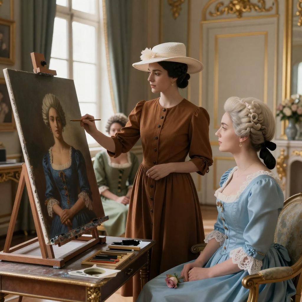 Photograph of three women in Victorian-style dresses with lace, bows, and puffed sleeves. The woman on the left has curly blonde hair, medium breasts, and a purple dress. The middle woman has dark hair, small breasts, and a yellow dress. The right woman has curly blonde hair, medium breasts, and an orange dress. All wear white gloves and hold fans. Background includes a golden wall, framed painting, and lit lamp. Women have neutral expressions.
