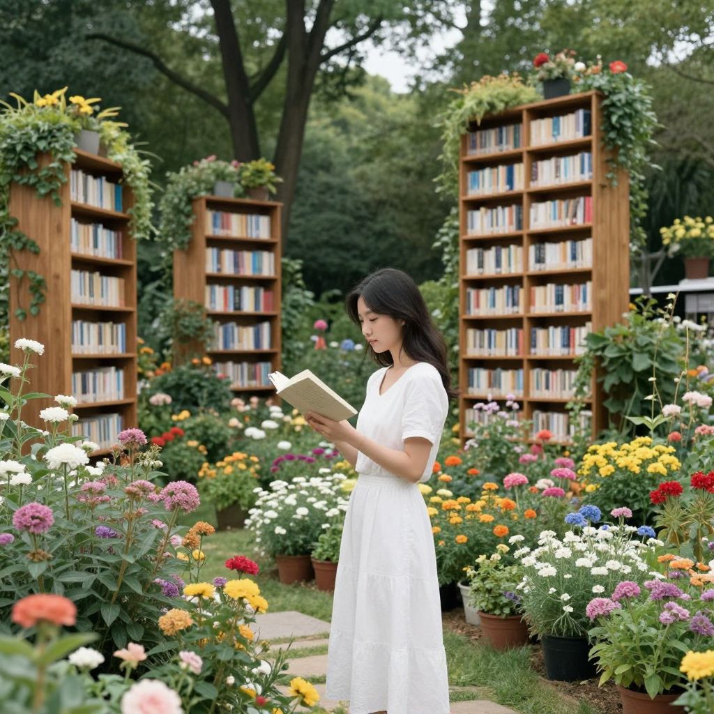 Photograph of an Asian woman in a white dress, reading a book in a vibrant garden filled with colorful flowers, surrounded by wooden bookshelves adorned