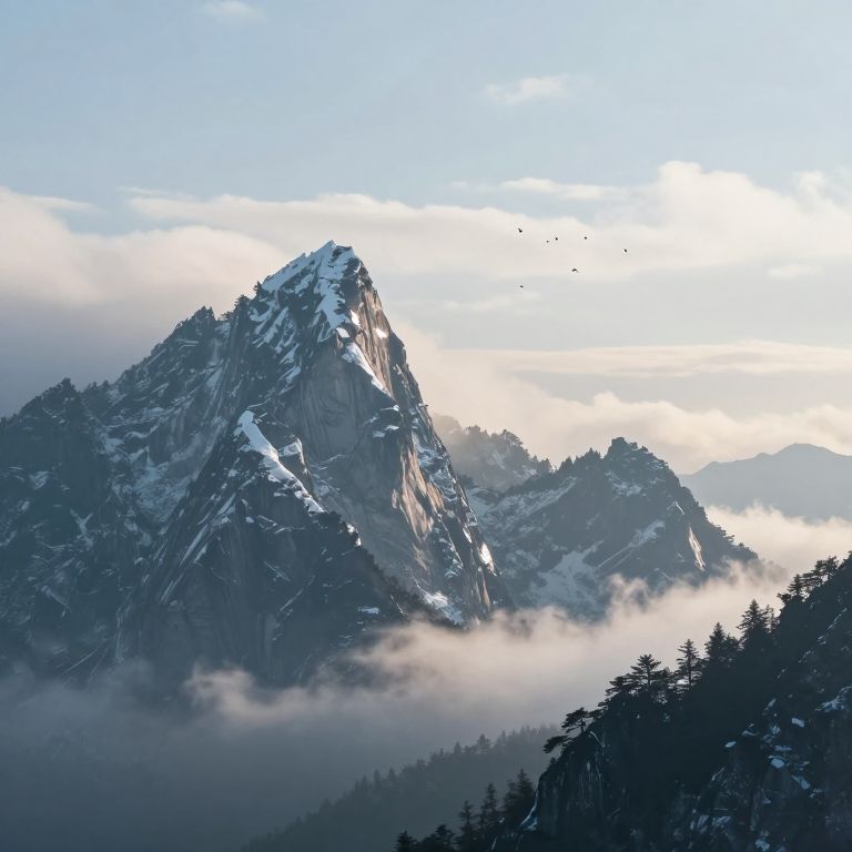 Whispers of serenity rise from the crystalline peaks as they cradle the sky, their jagged forms a testament to the eternal dance between stillness and freedom, while the soft hum of distant clouds and the silent flight of birds weave a tapestry of quiet transcendence.