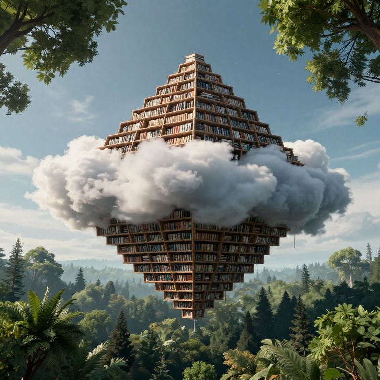 A colossal, blocky structure composed of countless wooden crates floats serenely above a lush forest, suspended by wispy clouds and delicate threads, defying gravity in a dreamlike, otherworldly scene.