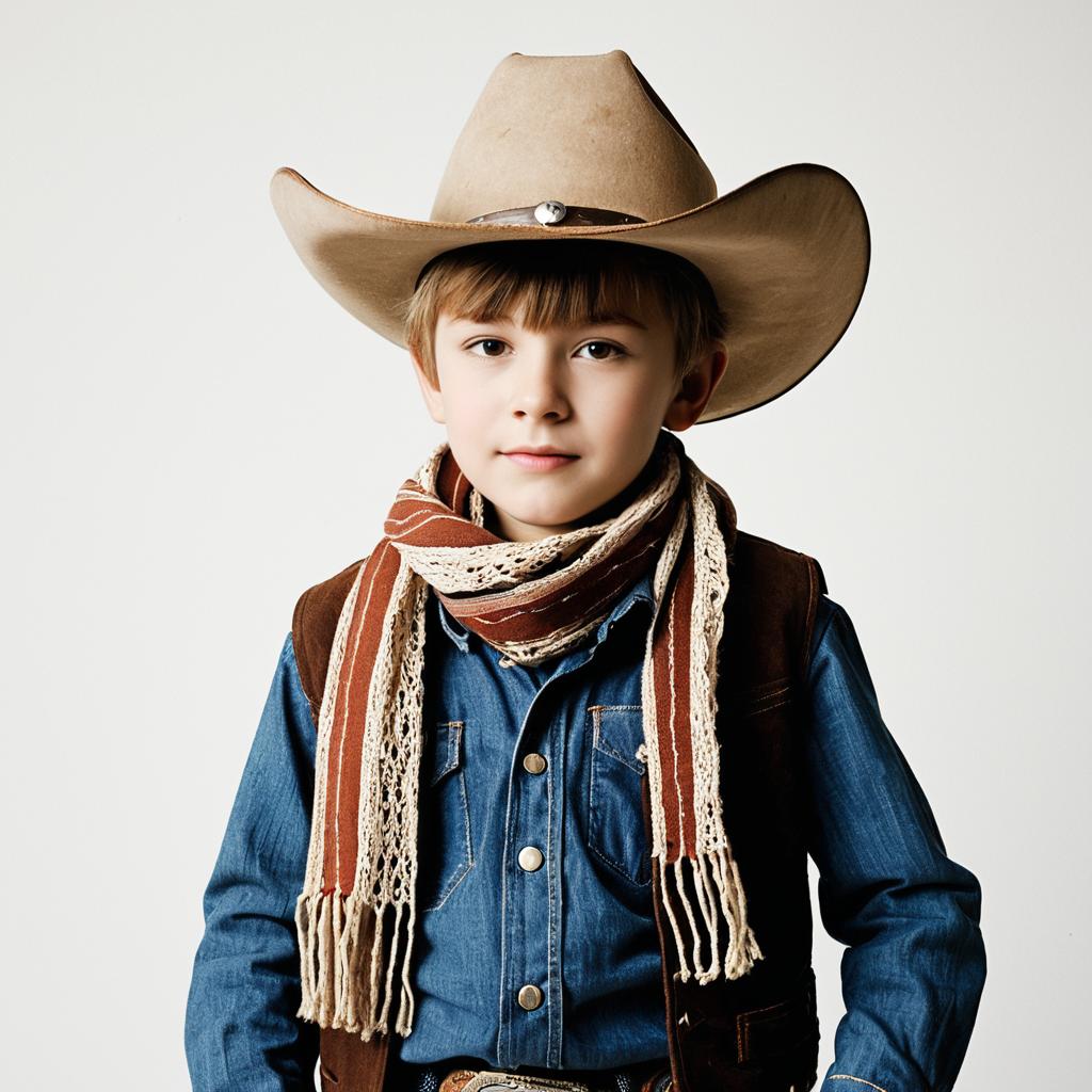 Portrait of a young Caucasian boy dressed in a realistic cowboy costume featuring a beige cowboy hat, brown suede vest, blue denim shirt, and a brown and cream striped scarf with lace details. The boy stands against a plain white background, embodying a classic western style.