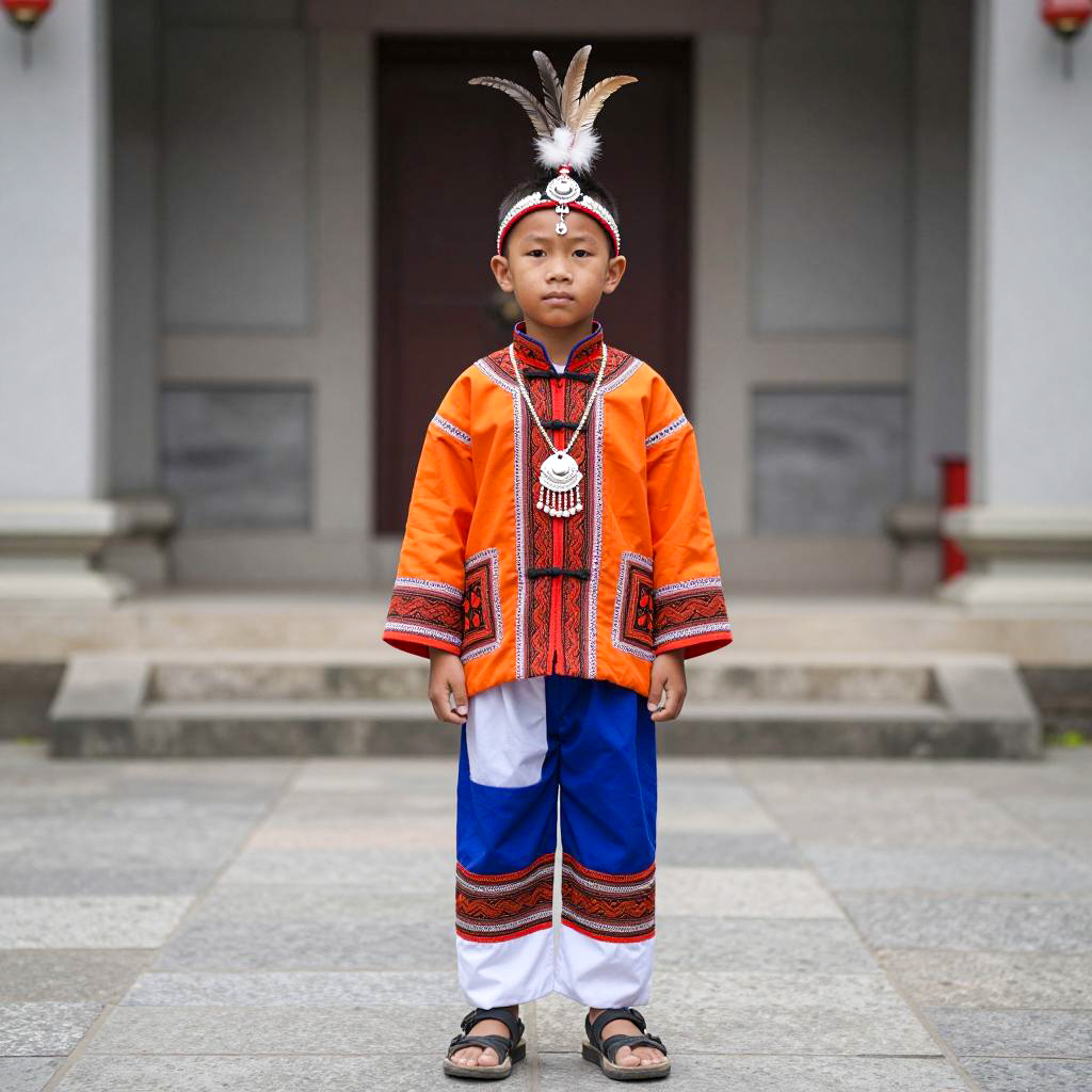 National costume boy, photograph of young boy standing, traditional ethnic attire, orange and red patterned shirt, blue and white pants, feathered headpiece, detailed jewelry, sandals, stone building background, daytime, natural light, cultural dress, Asian heritage, centered composition, full-body shot