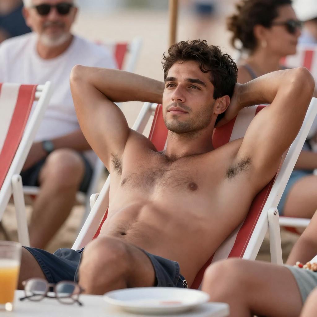 Photograph of a shirtless, muscular man with short dark hair, lying on a red-striped beach chair, arms behind head, chest hair visible, relaxed expression. Surrounding people, some sitting, out of focus. Various beach items, including glasses and a plate, in foreground. Sunlit, outdoor beach setting.