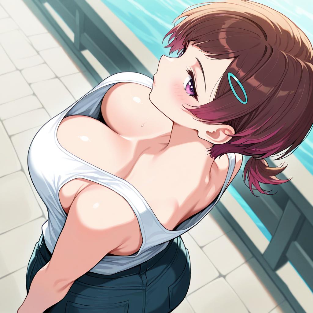 1girl, layered pixie cut, brown eyes, ash brown, hair ornament, ponytail, hairclip, bridge, large breasts, downblouse from behind, downblouse, from behind, tank top , white tank top, cleavage, from above, nape, head down, looking at viewer, looking back, looking up, sideways glance