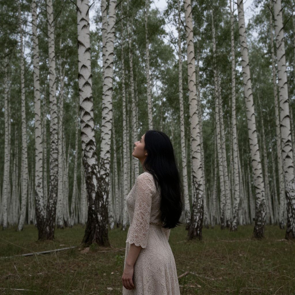 Photograph of a woman with long black hair in a lace dress, standing in a birch forest, looking upwards, surrounded by tall white birch