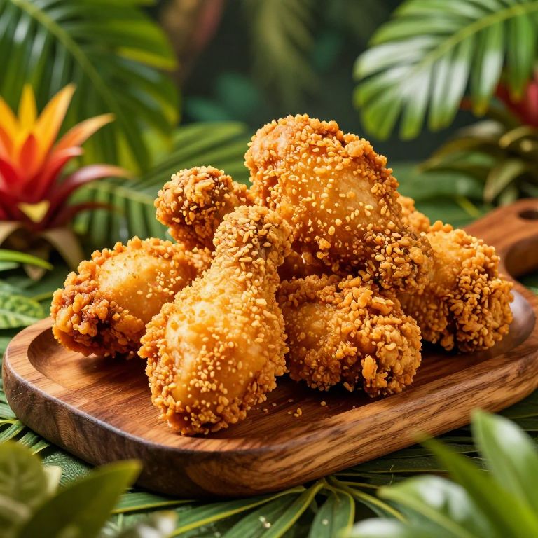 Monkey fried chicken sizzling golden brown on a rustic wooden platter, surrounded by tropical jungle foliage, vibrant colors, high detail, hyper realistic food photography style