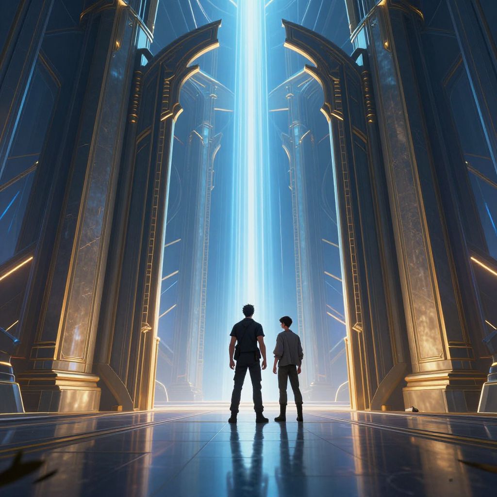 The gates of the utopia dimension with the a man and his brother standing, artstation, volumetric light, high detail, reflections, perfect, concept art, hdr, 4 k