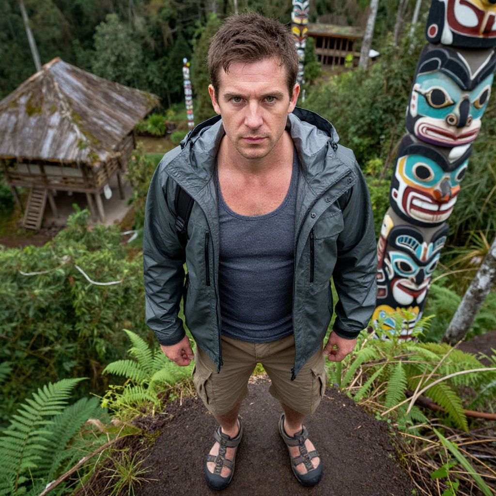 A man, heavy-duty shell jacket, moisture-wicking tank top, heavy-duty cargo shorts, waterproof hiking sandals, lush green forests, traditional wooden longhouses, vibrant totem poles, overhead shot, focused expression, adventurous spirit. Man has masculine face and piercing eyes