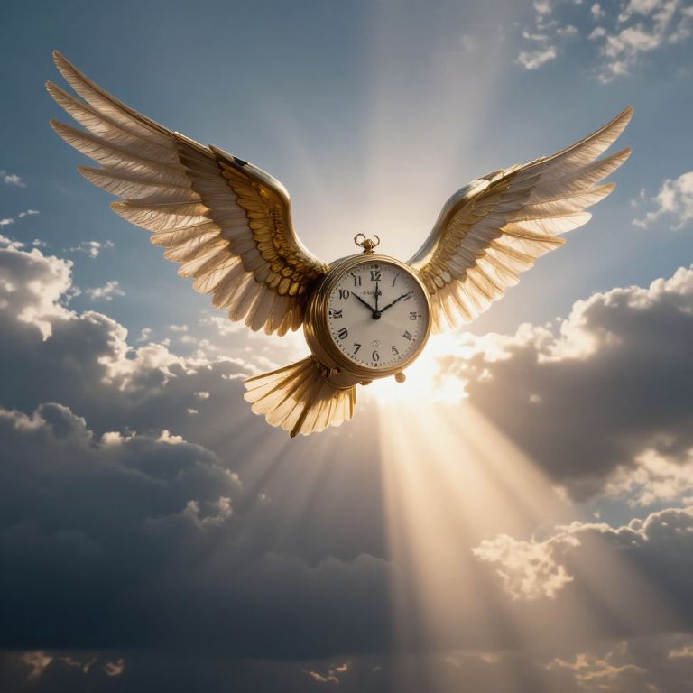Photograph of a clock with angel wings soaring in a bright sky, sun rays streaming through clouds behind it.