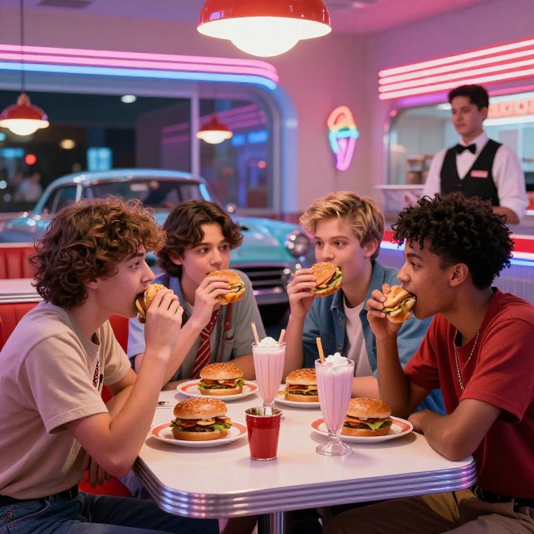 Photograph of four teenage boys with diverse hairstyles, eating burgers in a neon-lit, retro 50s diner, each with milkshakes and