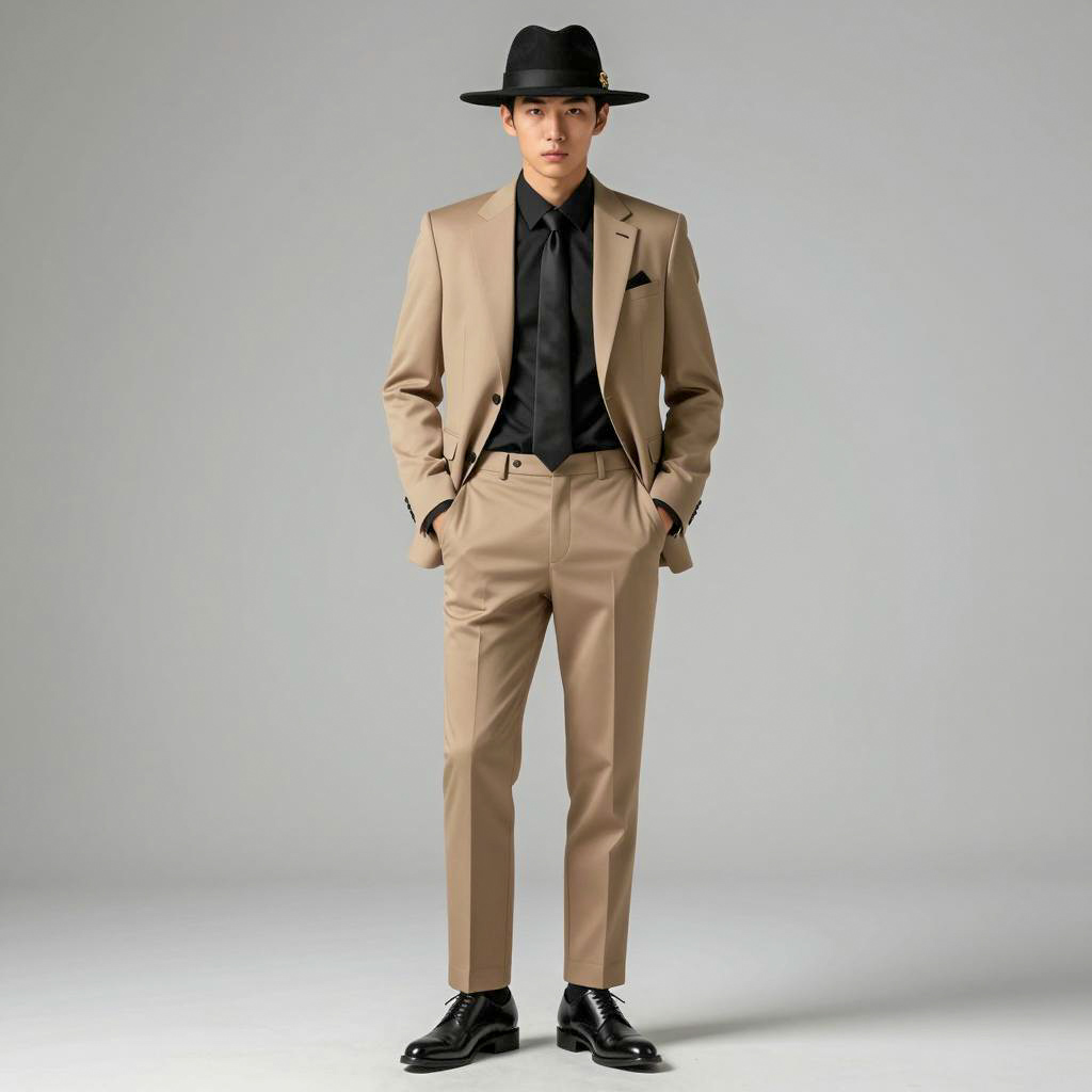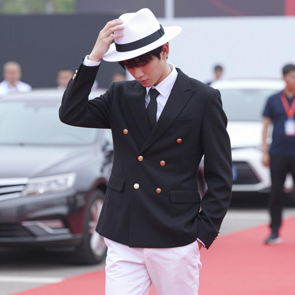 A young Asian man stands on a red carpet at an indoor event, dressed in a black double-breasted jacket with gold buttons, white pants, a white shirt, and a black tie. He is adjusting a white hat with a black band, looking down with a casual pose. The background features blurred figures and vehicles.