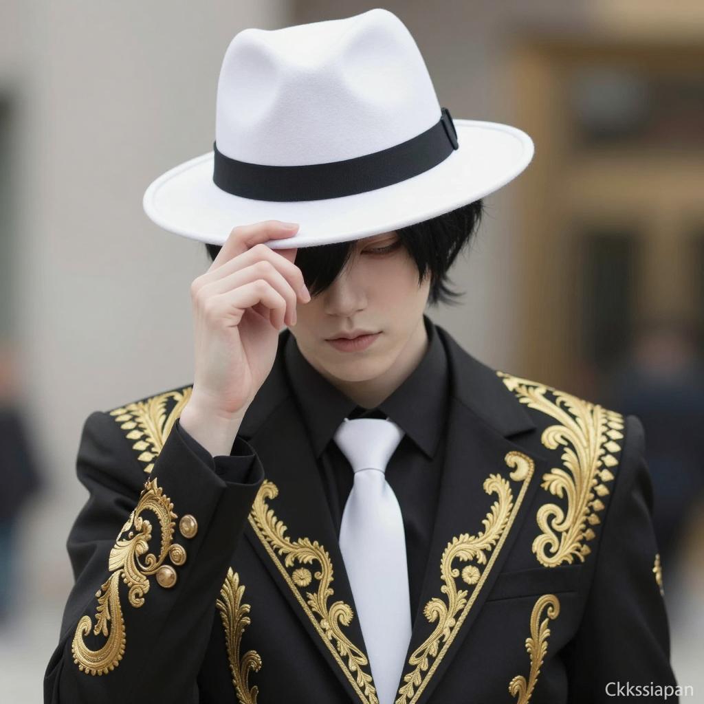 Young man in black jacket with gold buttons, white pants, and white hat with black band, adjusting hat with right hand. Black hair, pale skin, white shirt with black tie. Background: blurry indoor event with vehicles, red carpet. Standing, looking down. Full body, slightly angled. Casual pose.