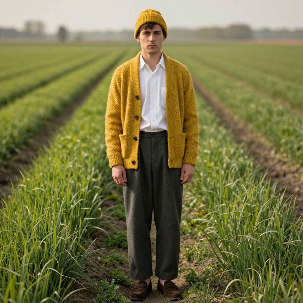 Photograph of a young Caucasian man standing in a vast, green, planted field. He has light brown hair, a fair complexion, and wears a yellow knit beanie, a textured yellow cardigan with black buttons, a white button-up shirt, and dark gray, loose-fitting trousers. His brown shoes are slightly worn. The field's rows of tall green plants stretch into the blurred background under a bright, overcast sky. The man stands in the center, looking directly at the camera with a neutral expression. The image has a slightly surreal, hyper-realistic style.