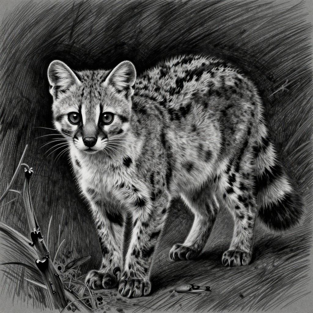 Black-and-white ink drawing of a spotted feline, resembling a serval, with large eyes, standing alert amidst dark, textured grass.
