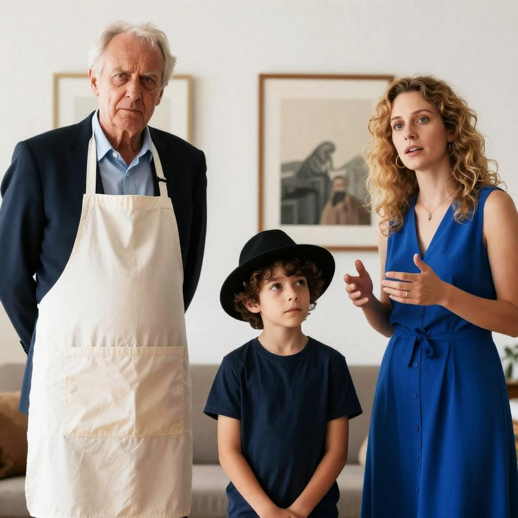 Photograph of three people. Elderly man in dark suit and apron stands left, looking stern. Young boy with curly hair and black hat stands center, looking up. Young woman with blonde curls and blue dress gestures right, speaking. Indoor setting, wall art in background.